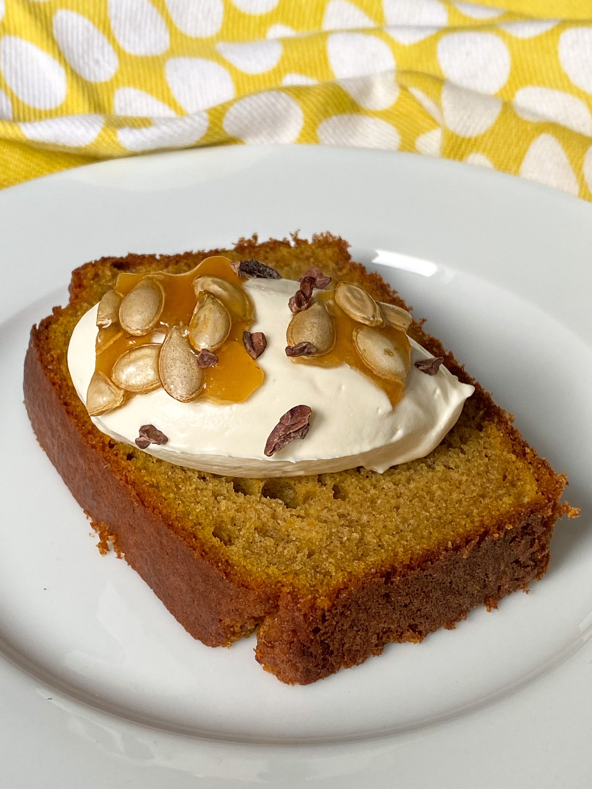 I like to top my squash cake with whipped cream and something crunchy for texture—cocoa nibs, nuts, or if you're really getting into it, roasted and caramelized seeds from the squash itself. What's the word for nose-to-tail baking?
